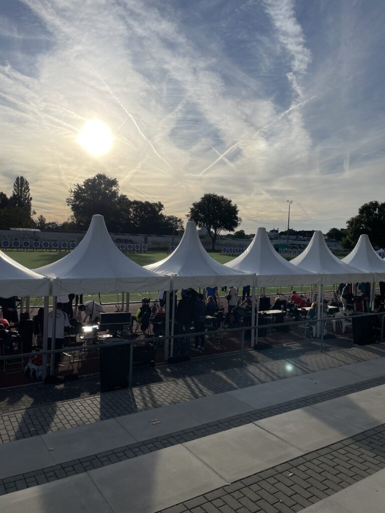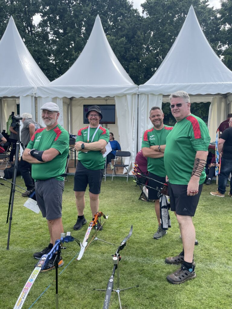 Schon im Qualifikations-Schießen mit 72 Pfeilen auf 50 Meter, zeigten die Drei, dass sie in Topform sind: Mit starken Einzelleistungen sicherten sie sich den Einzug in den Teamwettbewerb Blankbogen männlich und starteten dort zunächst von einem sehr soliden Platz 5 von 16 Teams – mit insgesamt 1597 Ringen.